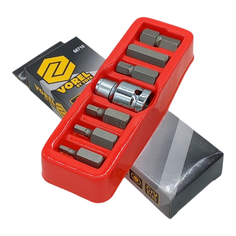 La VOREL 66710 è una serie di inserti per chiavi a brugola (Allen) realizzati in acciaio al cromo vanadio, un materiale noto per la sua elevata resistenza e durata. Il set comprende 7 pezzi di misure comprese tra H4 e H12, utilizzabili in applicazioni manuali con strumenti come chiavi a cricchetto o cacciaviti. È ideale per lavori di fai-da-te, riparazioni meccaniche e professionali, grazie alla sua robustezza e versatilità. Questo tipo di inserti è comunemente usato per stringere o allentare bulloni e viti esagonali.